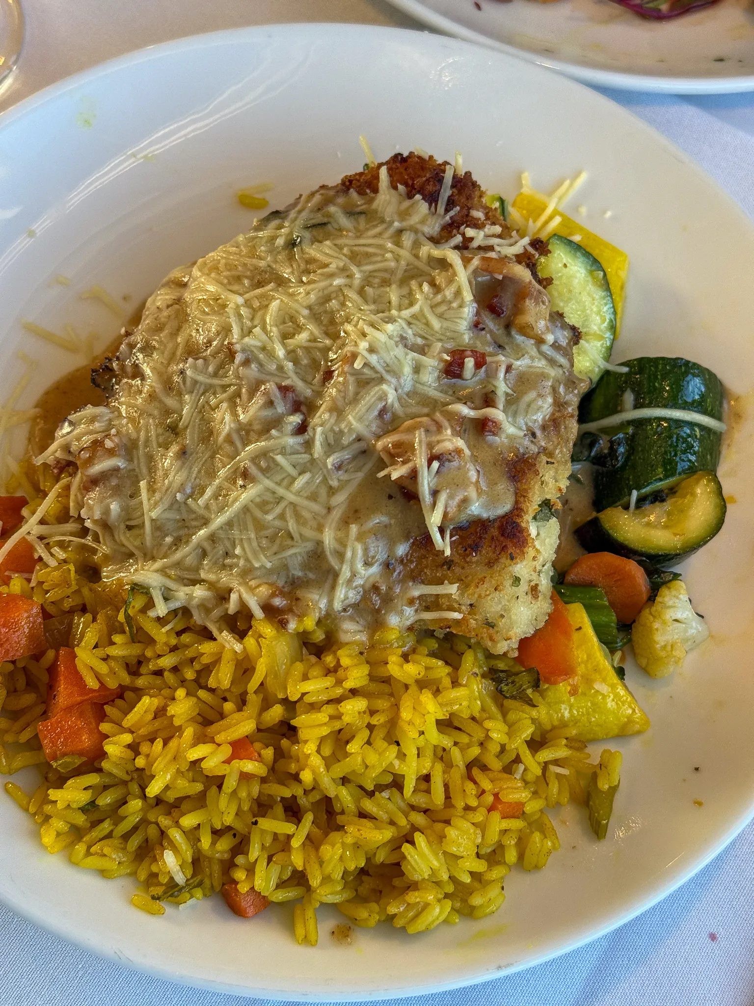 - Our meal included bread, salad with a mixed berry vinaigrette, chicken and beef tenderloin entrees were plated and served to us. For dessert, we had the lightest yet perfect New York style cheesecake with a mixed berry sauce. Also the chocolate cake was so rich! But oh so good! Cocktails included a manhattan, version of a French 75 named the Spirit ‘94 in honor of the boat’s inaugural voyage! We then had the margarita and aperol spritz.
