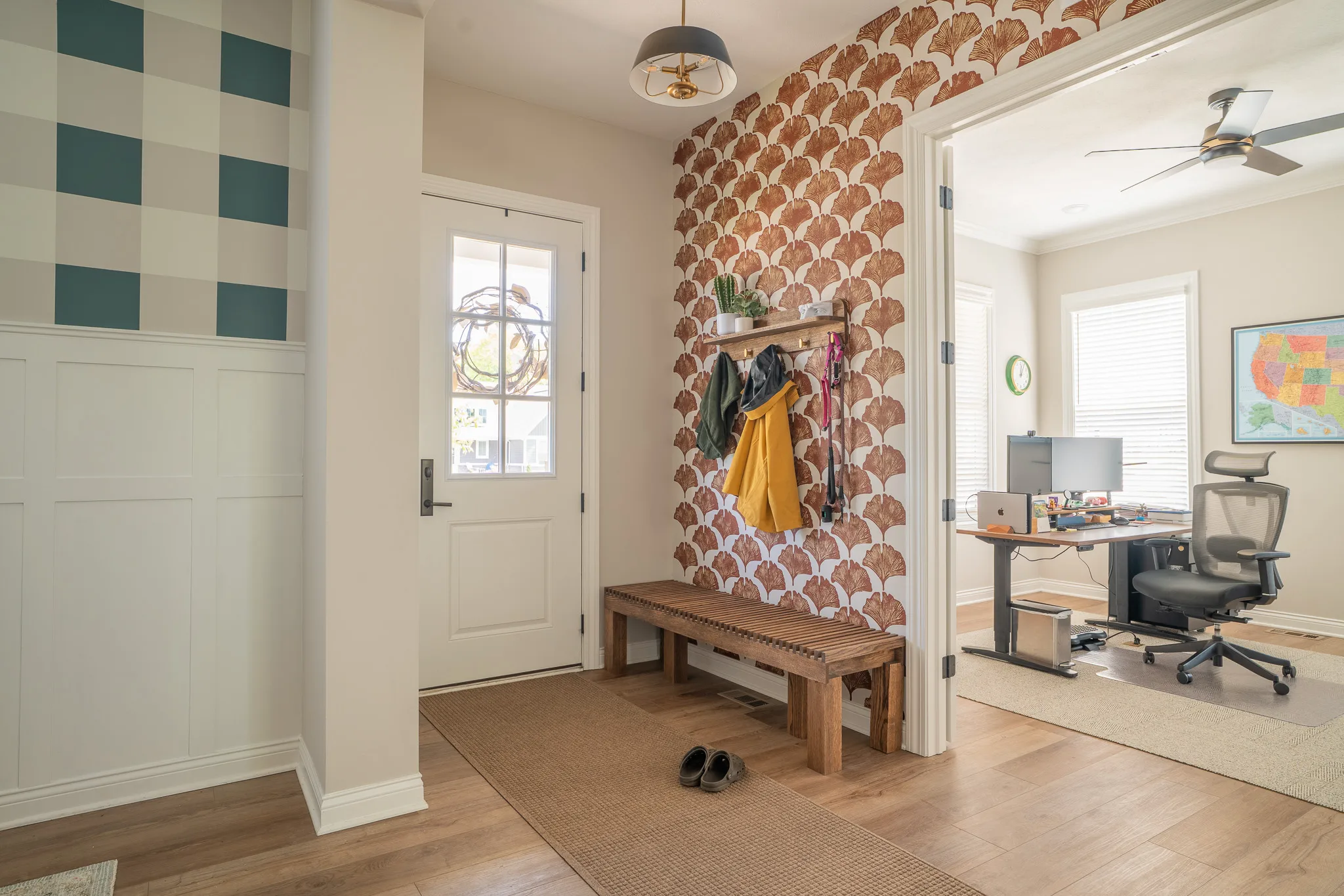 Partnering with Lowe’s, we added box molding and a checkerboard plaid (some say gingham) painting technique to the walls to transform the space into something warm and inviting. It is airy and timeless.
