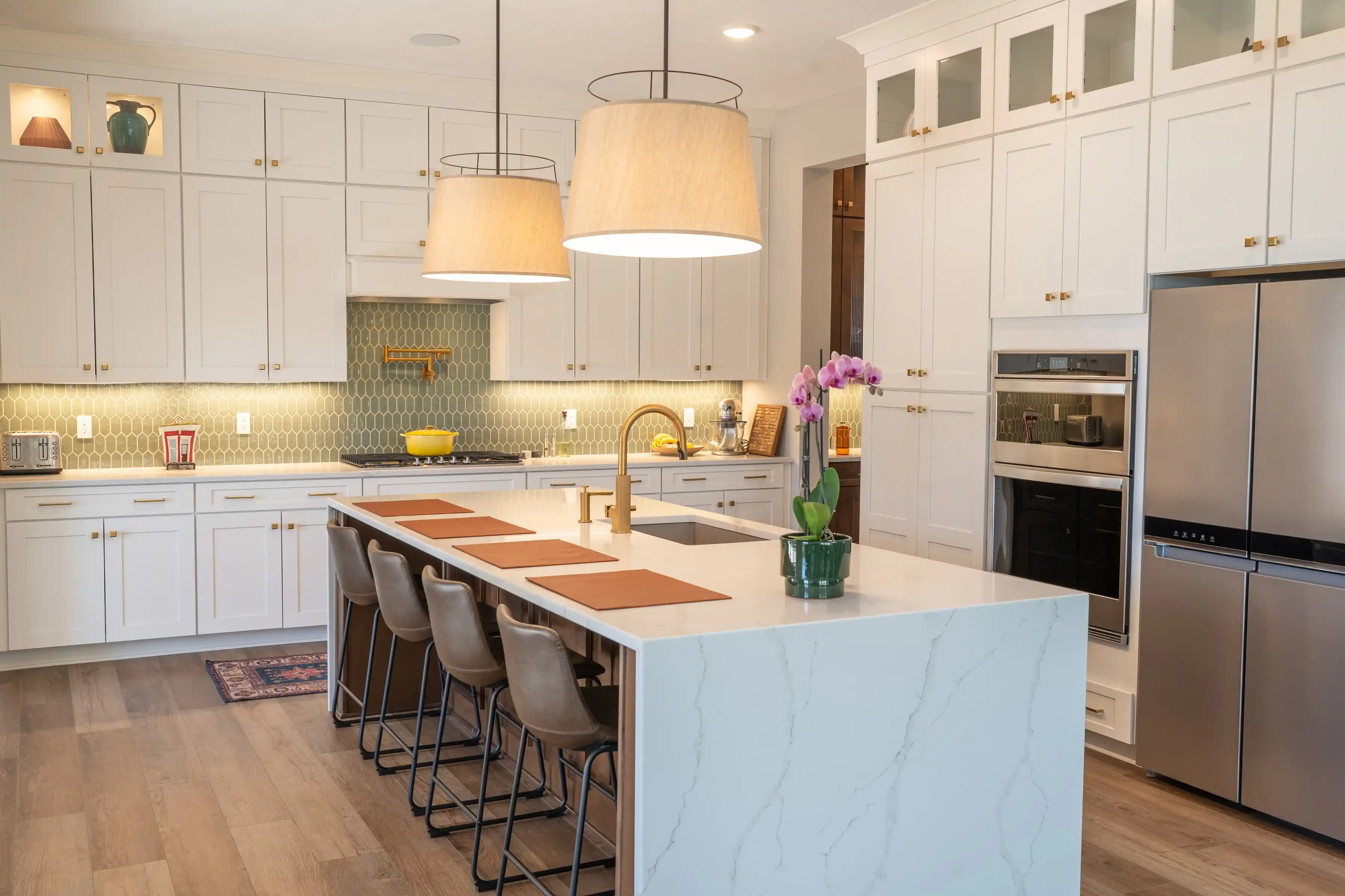 We chose to continue the hard surface flooring in this room as it is in the foyer and adjacent Study. A large 9’ x 12’ rug from Homesense offers cool tones in the room. The kitchen is accessible through our Butler’s Pantry with floor-to-ceiling cabinetry and a counter that we use for our espresso machine.
