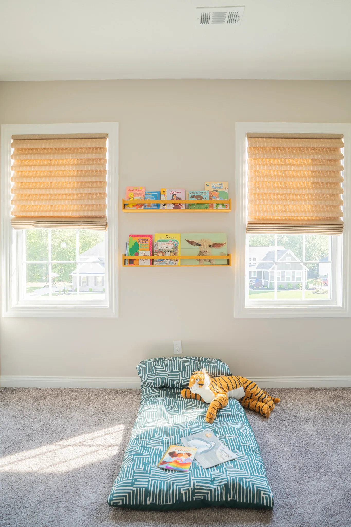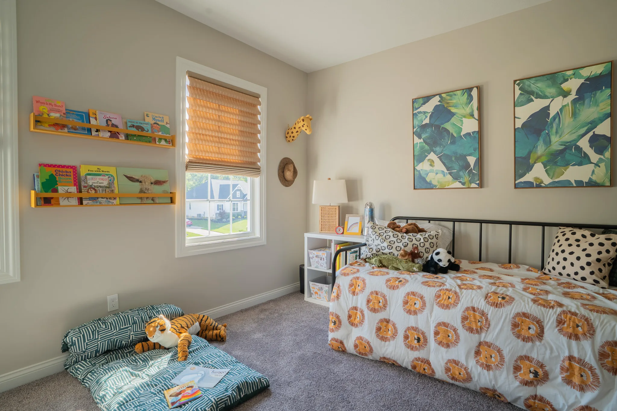 We chose to decorate the space with a gender-neutral safari theme. We decided to use colors like yellow and green to bring calming energy to this space. We brought in a twin-size daybed to start as it opens up the room for imagination, play, and the age of a child who might call this home.