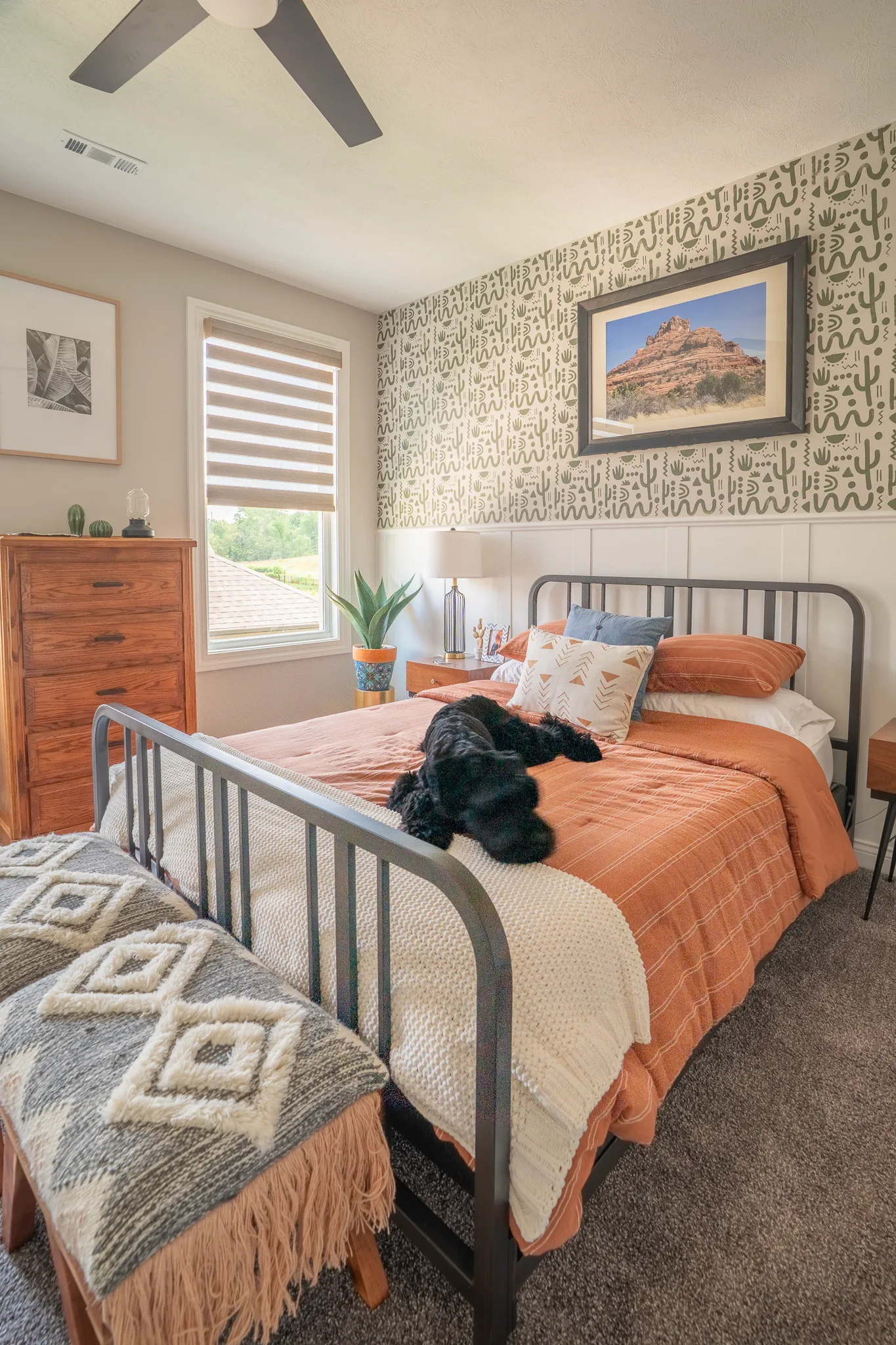We had a large print framed of a photograph we took in Sedona, Arizona. Bedding from Target in a Cognac color brings the earthy terra cotta we love into space. Walnut wood-stained furniture with black hardware grounds the room.
