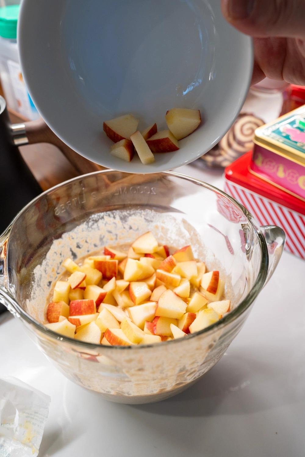 We always buy honeycrisp or gala apples with a plan to snack on them by themselves for the health benefits they bring. But then the weekend hits and here we are looking at the apples on the counter that we didn't eat during the week. What to do? Make pancakes of course!
