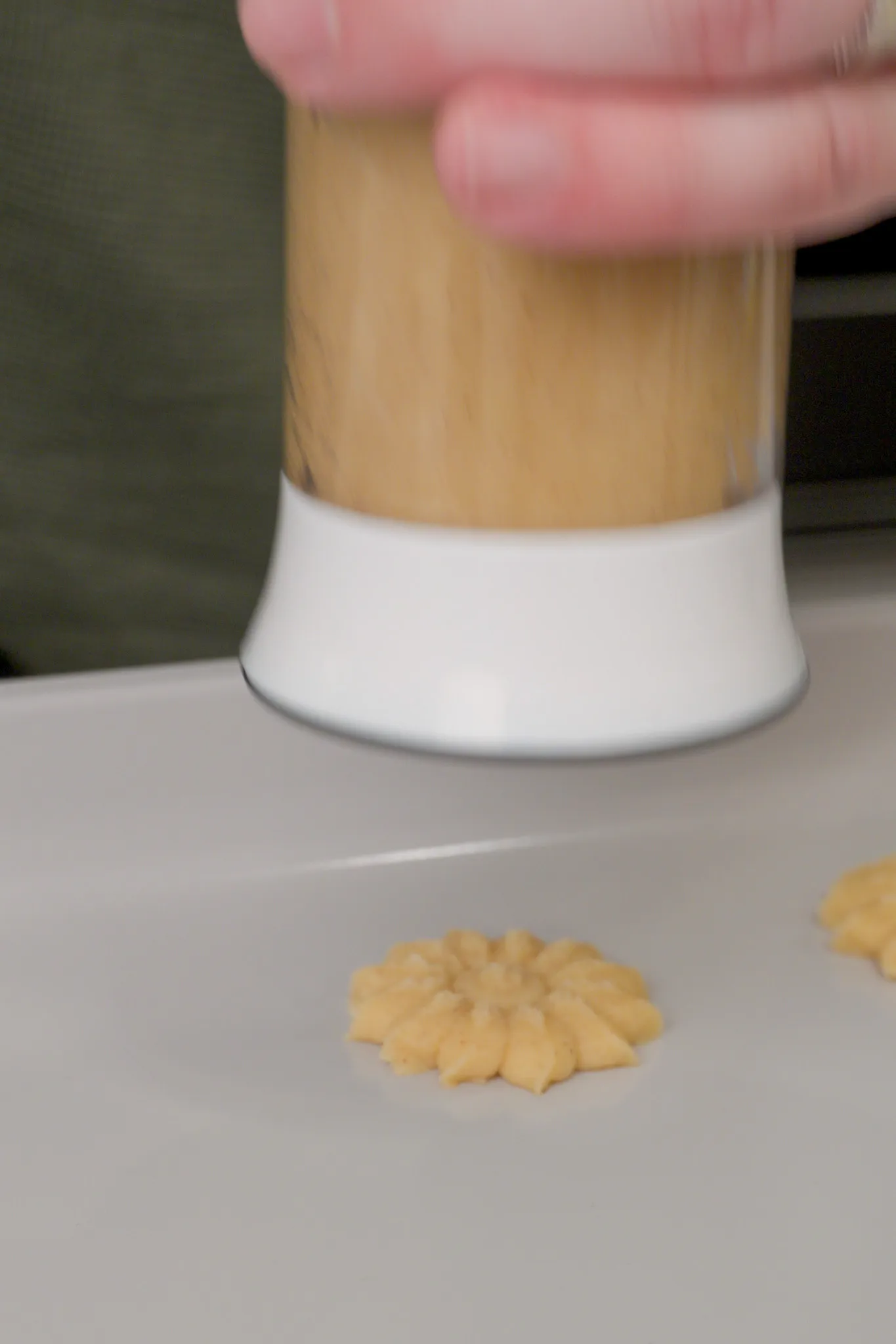 - Place dough in Cookie Press with the desired disk. Press dough onto an ungreased baking sheet.