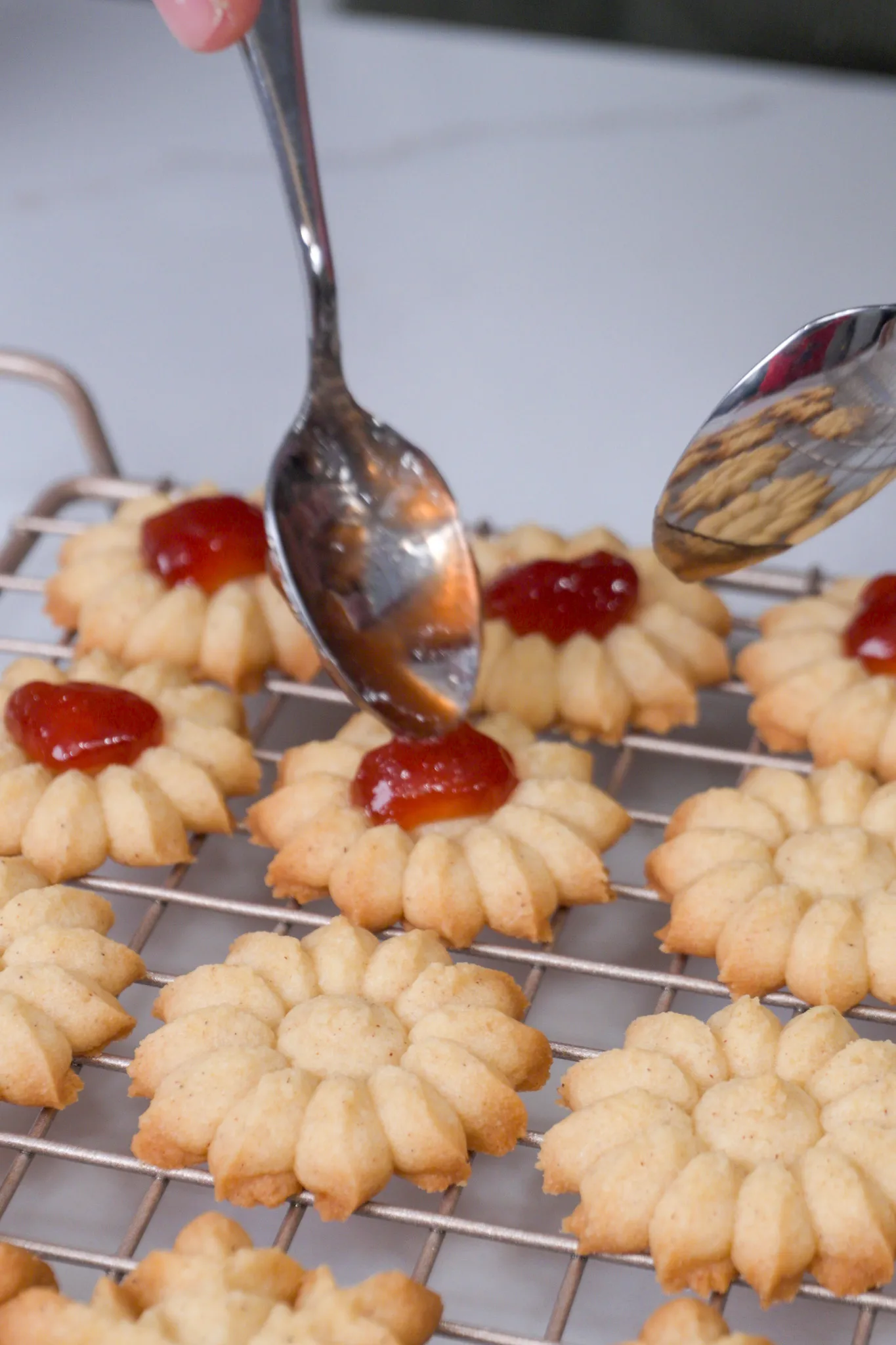 We have never made spritz cookies together. We used the OXO Cookie Press and made this cream cheese variety. We even added a little bit of strawberry jam to some of the ones in the centers.