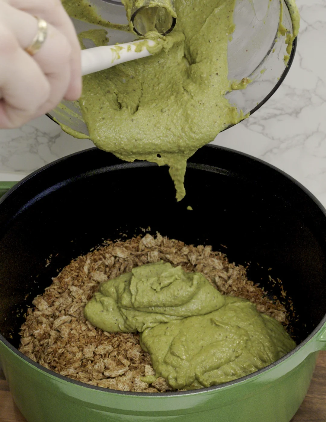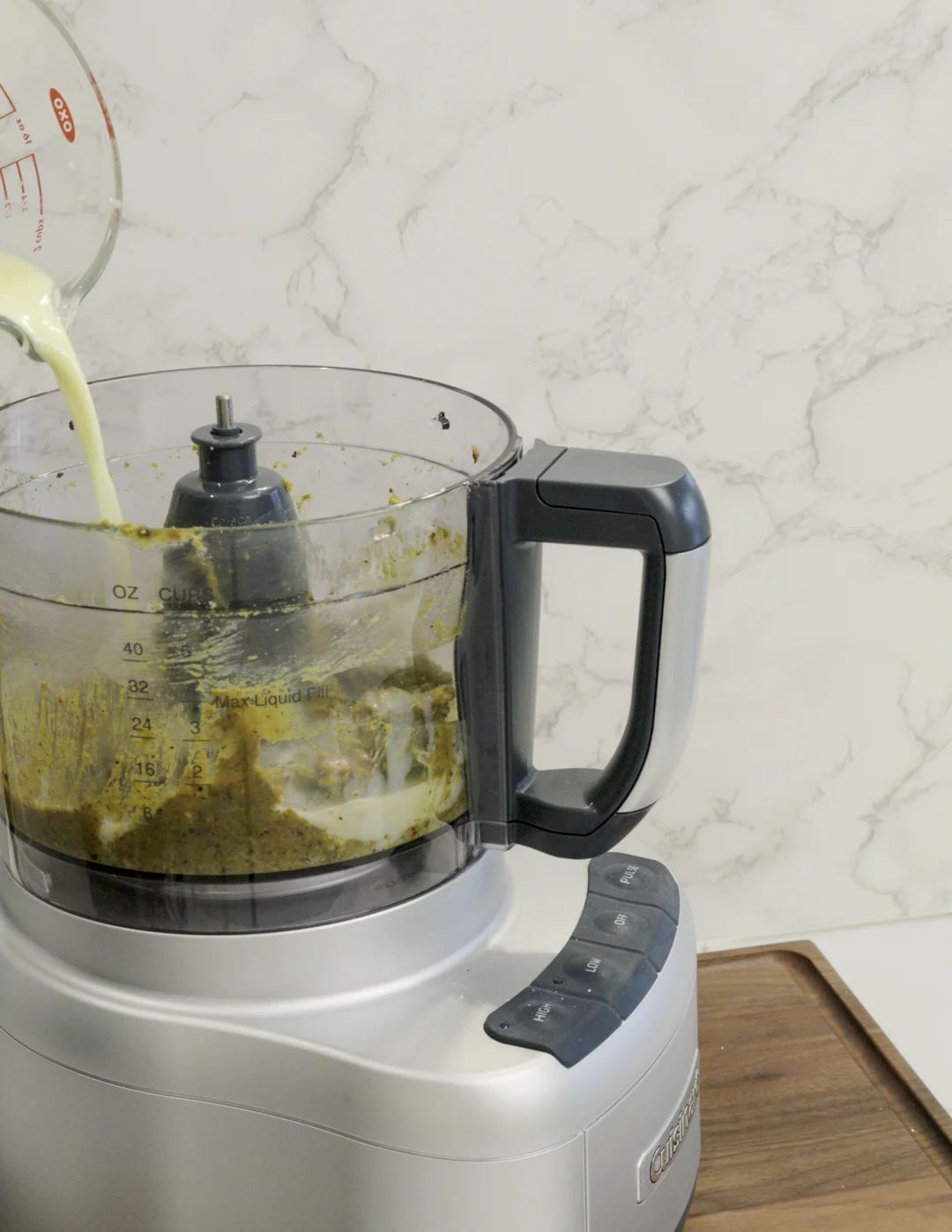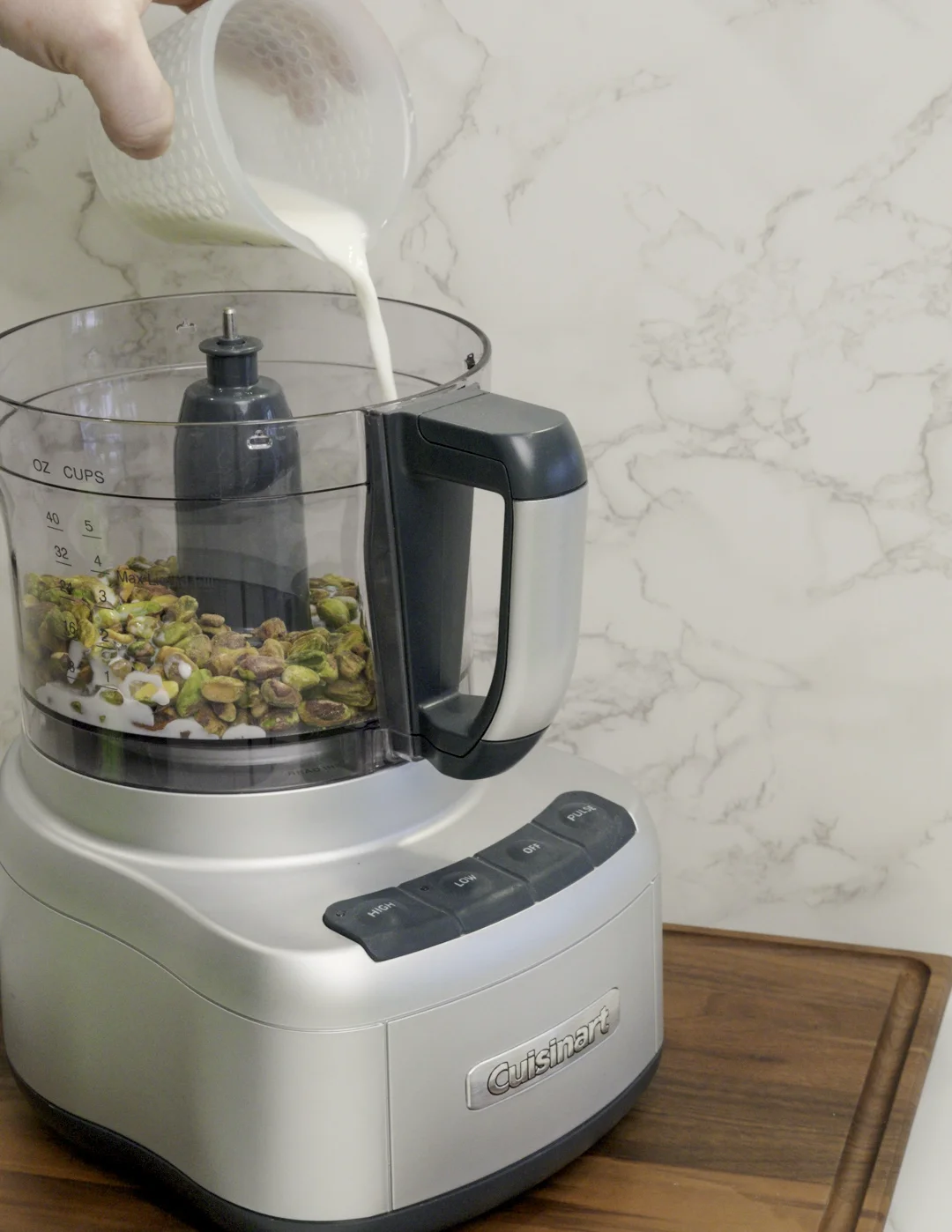 - In a food processor, add pistachios, remaining milk, and powdered sugar. Process 4-5 minutes until smooth, stopping a few times to scrape down the sides. Add melted white chocolate mixture and a pinch of salt. Process for an additional 2-3 minutes, until smooth and creamy.