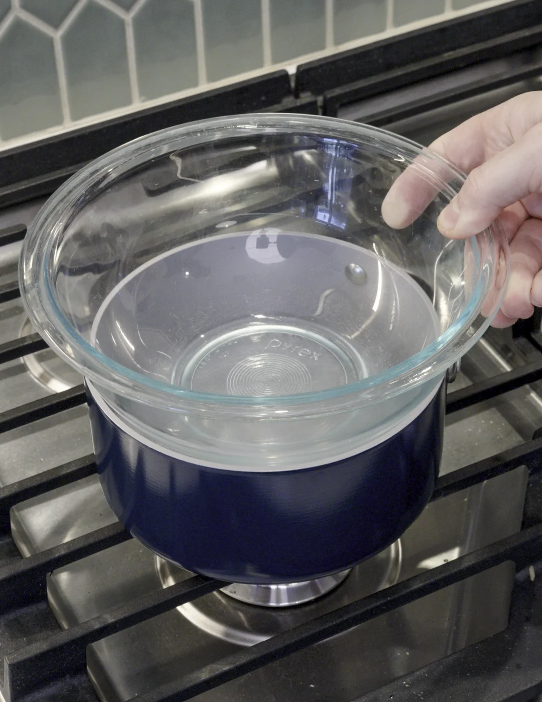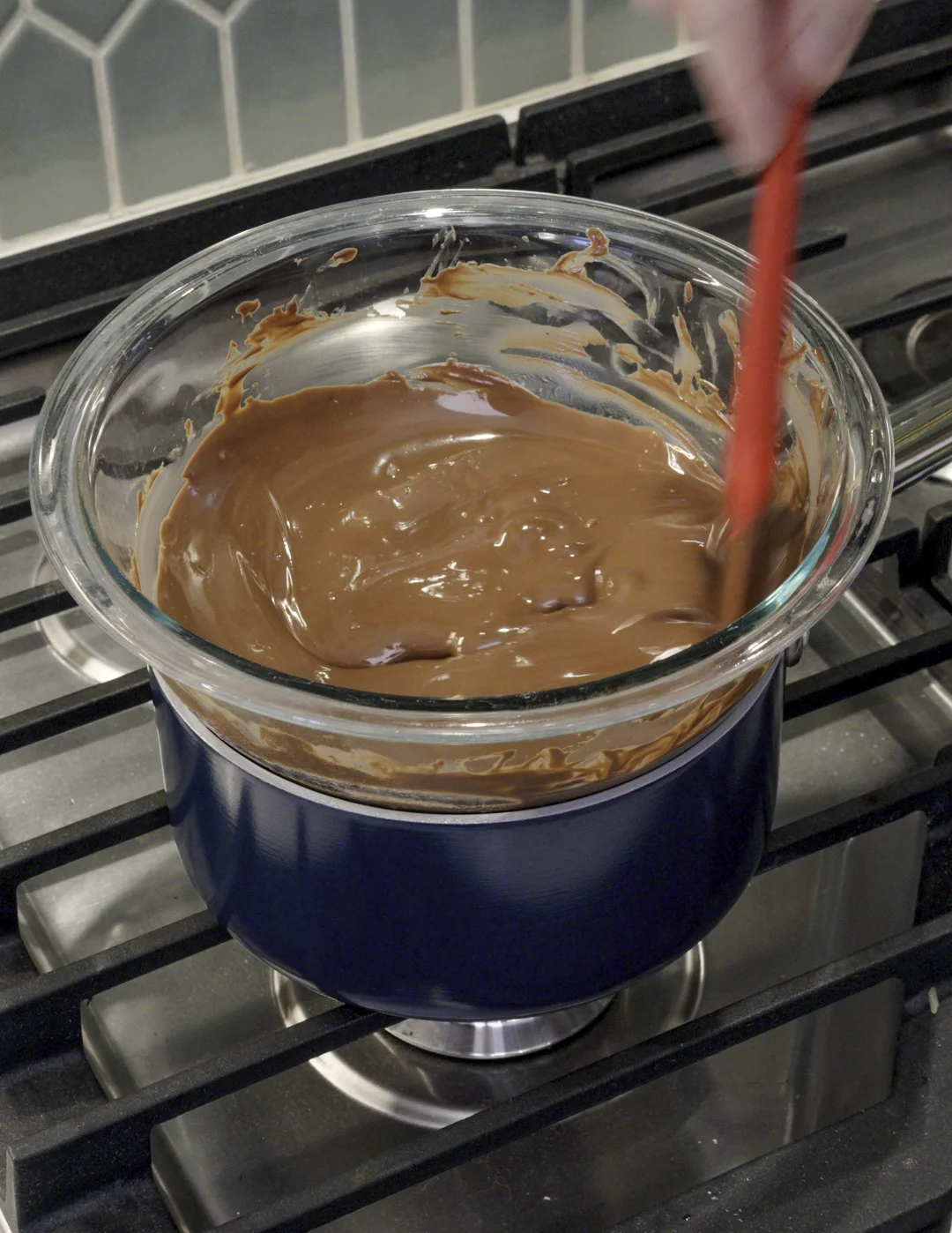 - Melt milk chocolate wafers in a glass bowl over a small saucepan of simmering water. Stir constantly until completely smooth and melted.