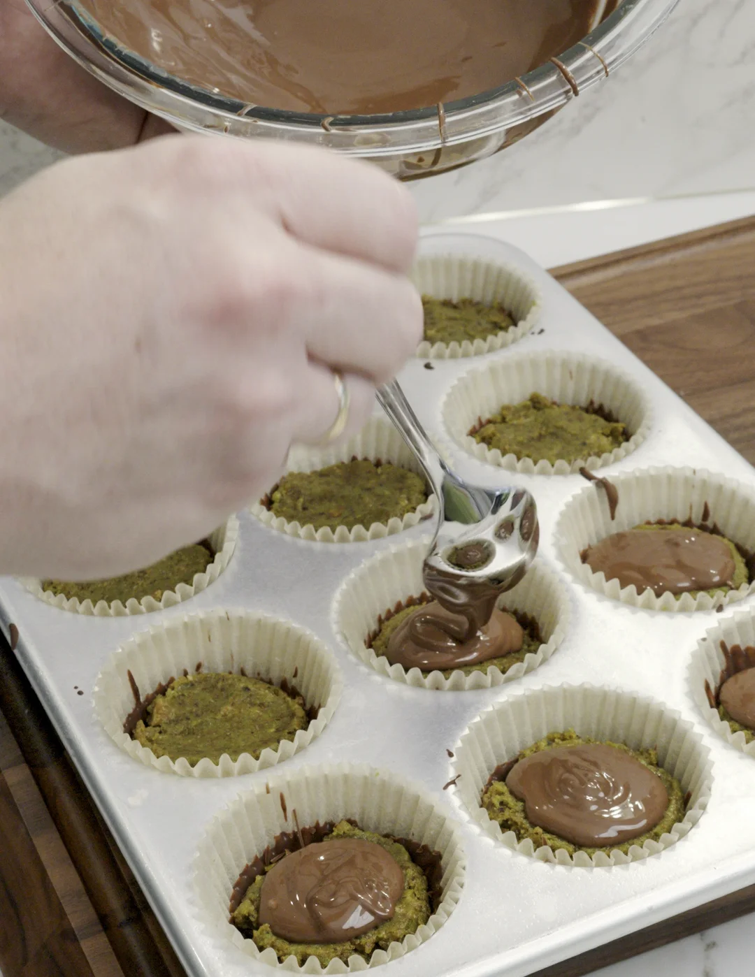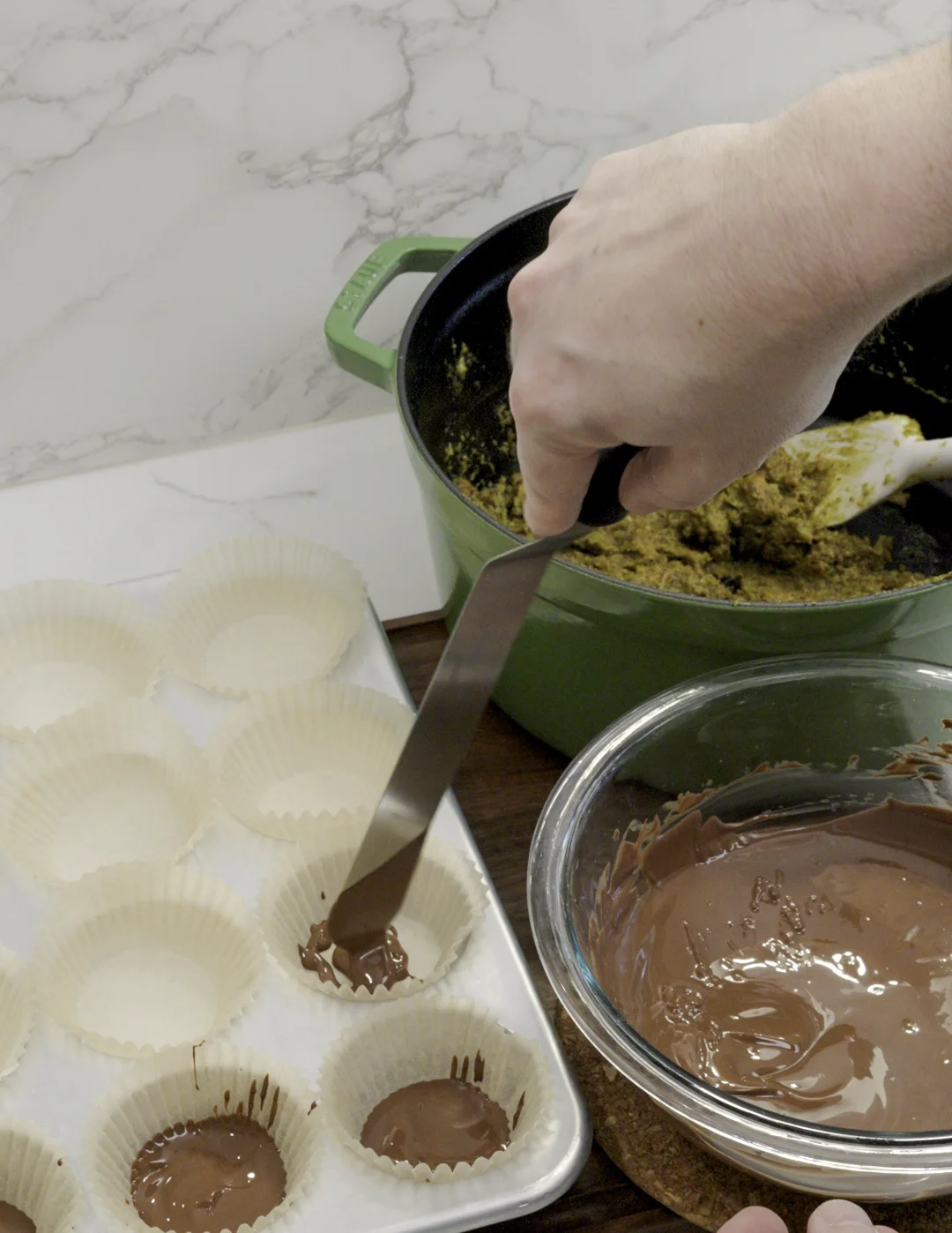 - Use parchment liners in the cups of a muffin pan. Coat the bottoms with melted milk chocolate to form a thin layer. Use an offset spatula to line the sides of the parchment cups, halfway up. Freeze for 10 minutes.