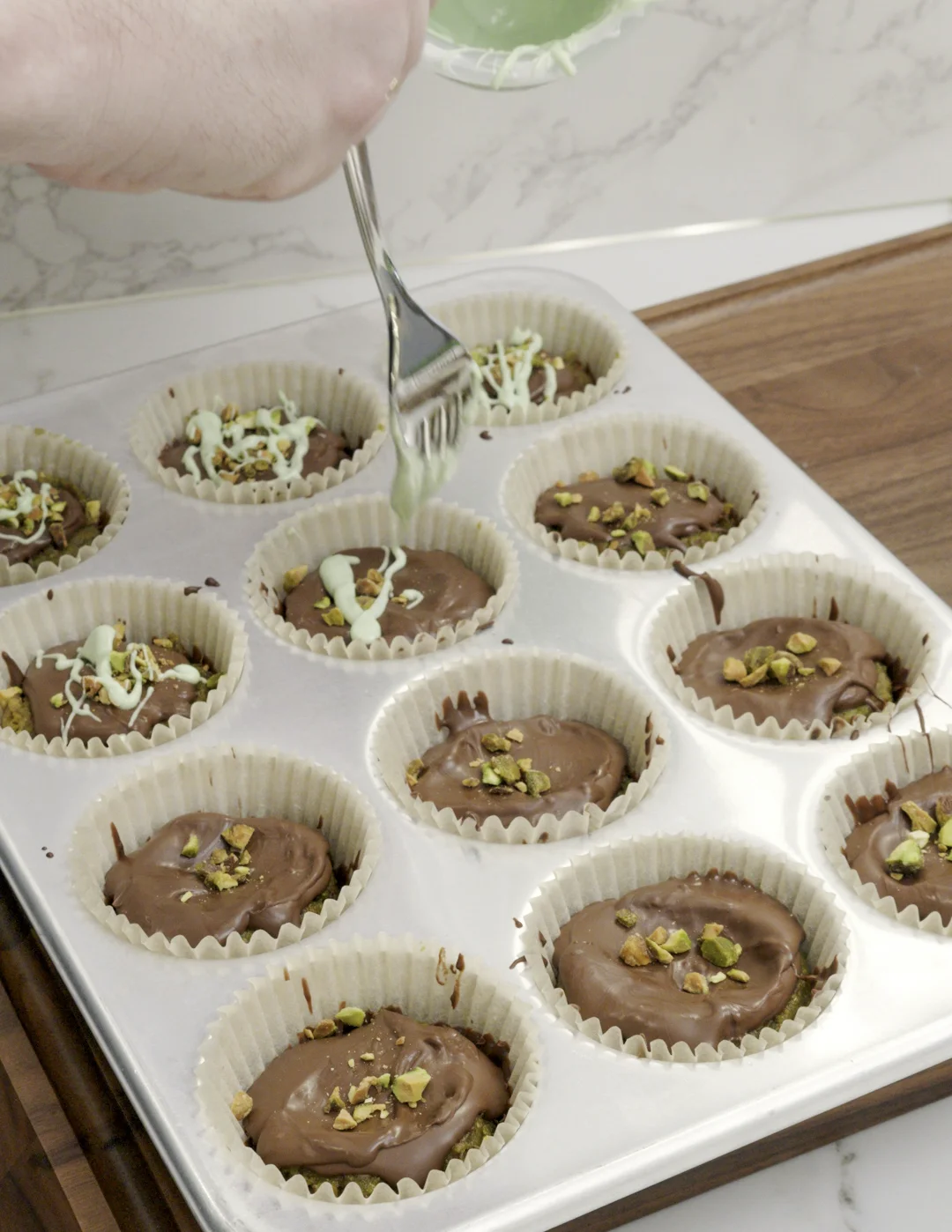 - Use a similar method to the above to melt the white chocolate wafers. Add food coloring and stir to achieve a light green. Use a fork to drizzle over the cups.