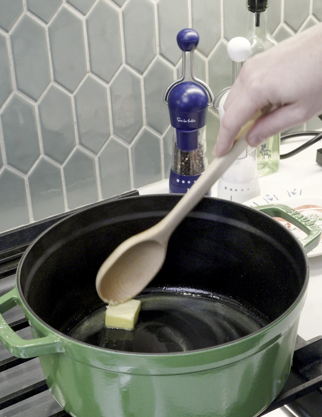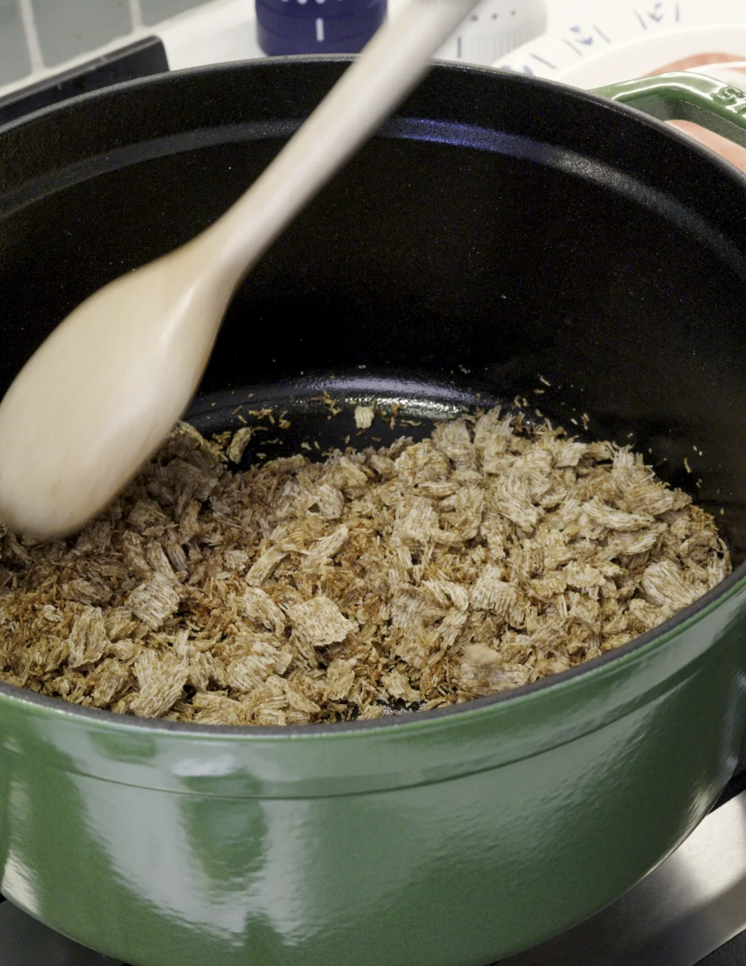 - Melt 2 T butter in a Dutch Oven or a 10” skillet over medium heat. Add shredded wheat. Cook 8-10 minutes, stirring occasionally to toast the cereal. Remove from heat.