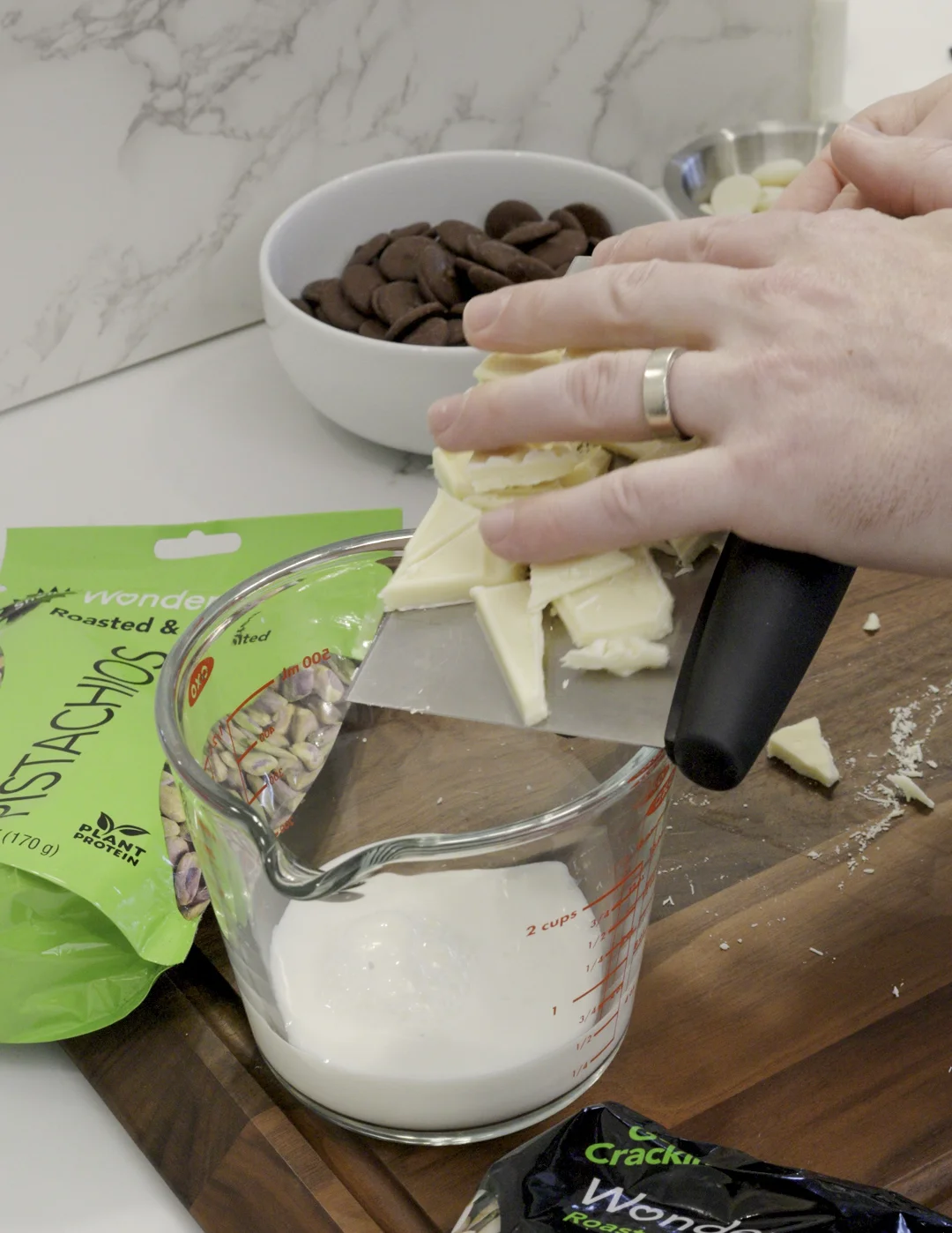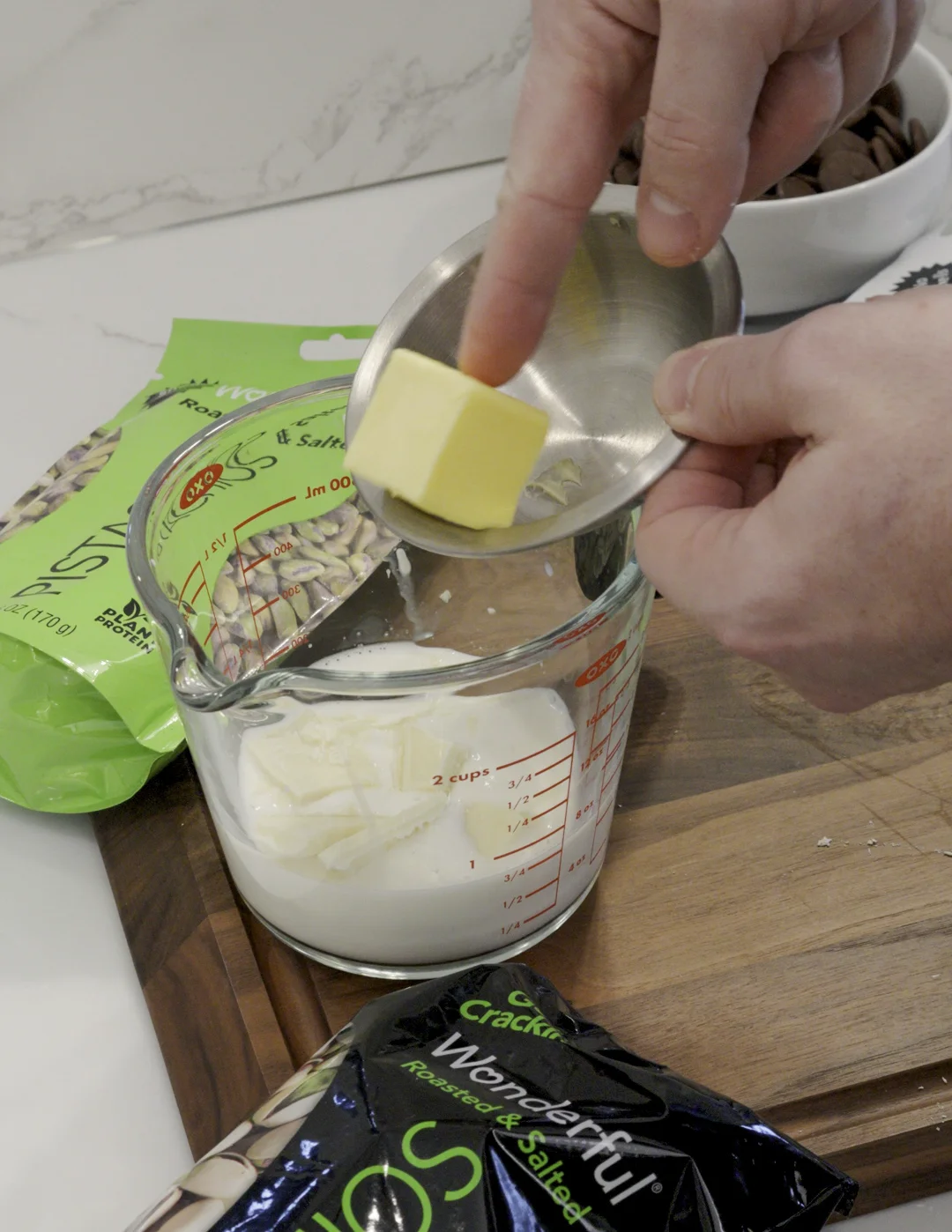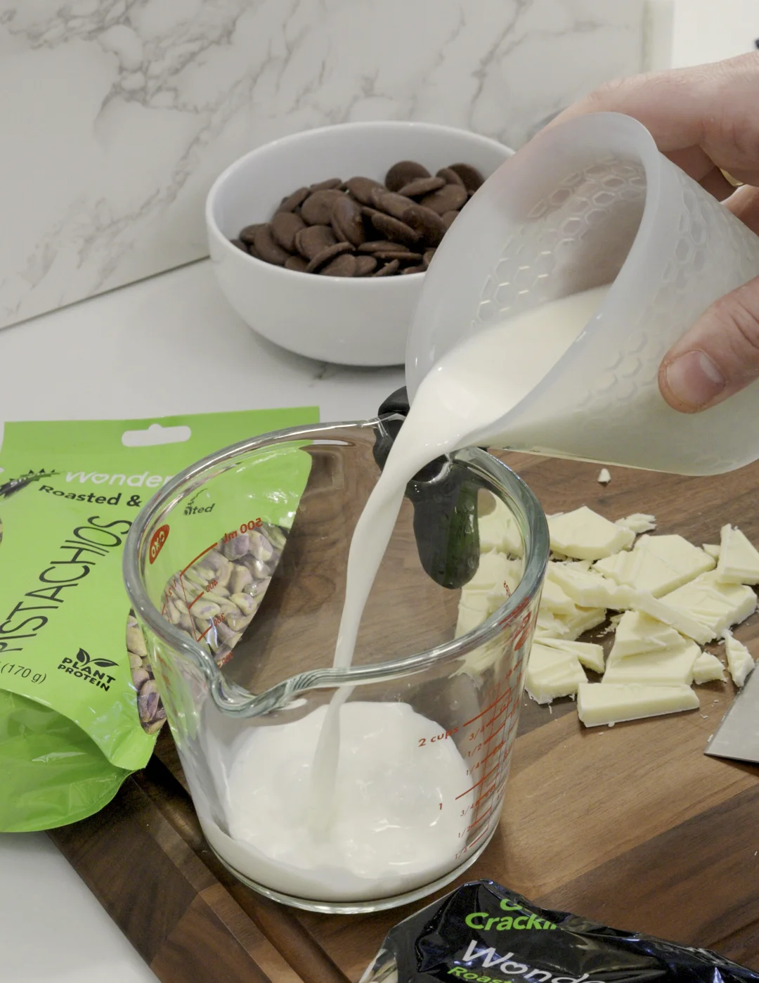 - In a microwave-safe container, add 1/2 c milk, remaining butter, and white chocolate baking bar pieces. Microwave at 50% power for 30 seconds. Stir, then microwave again at 50% power for 30 seconds. Stir, and microwave one last time if needed at 50% power for 30 seconds until completely smooth and melted.