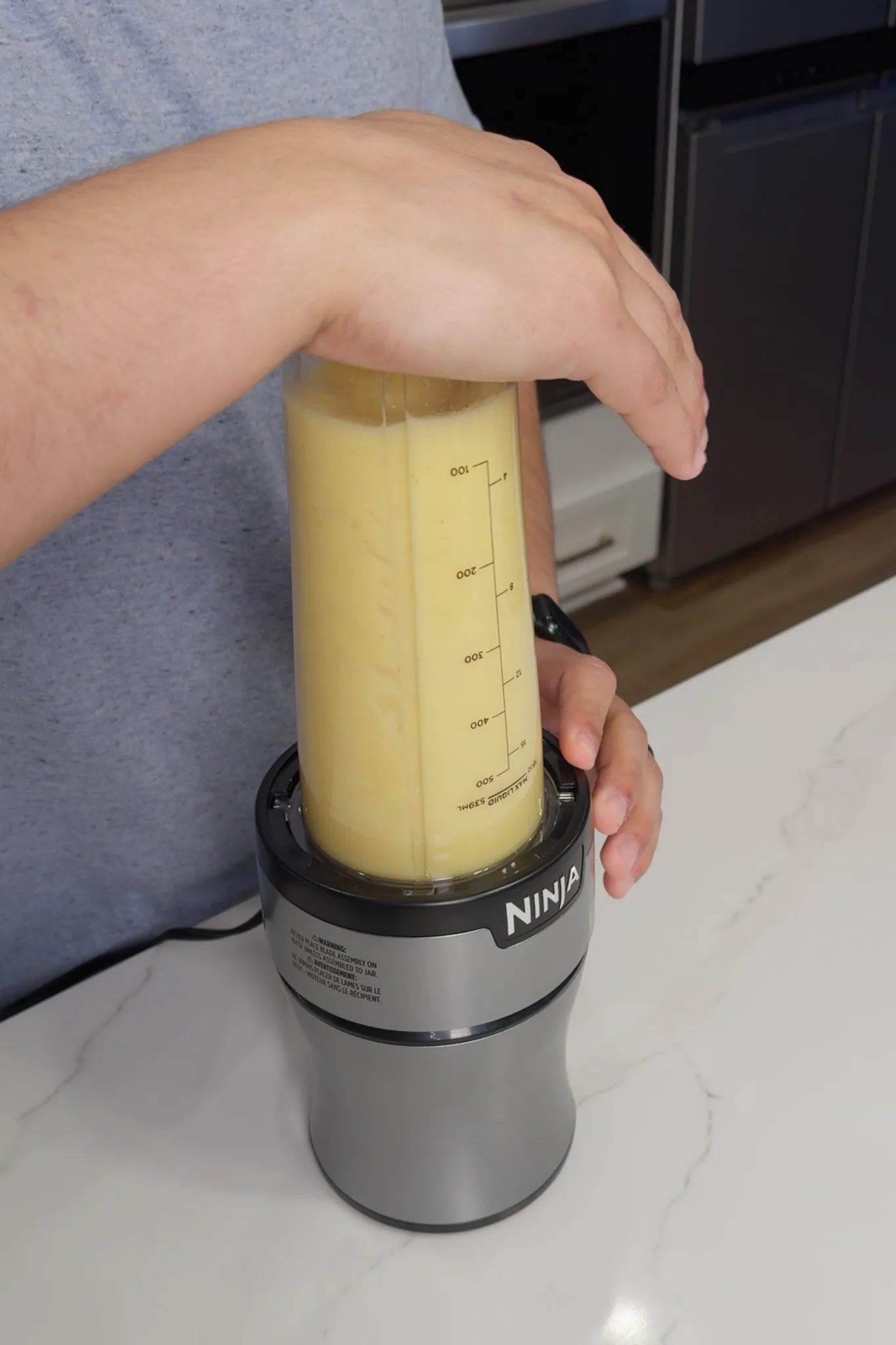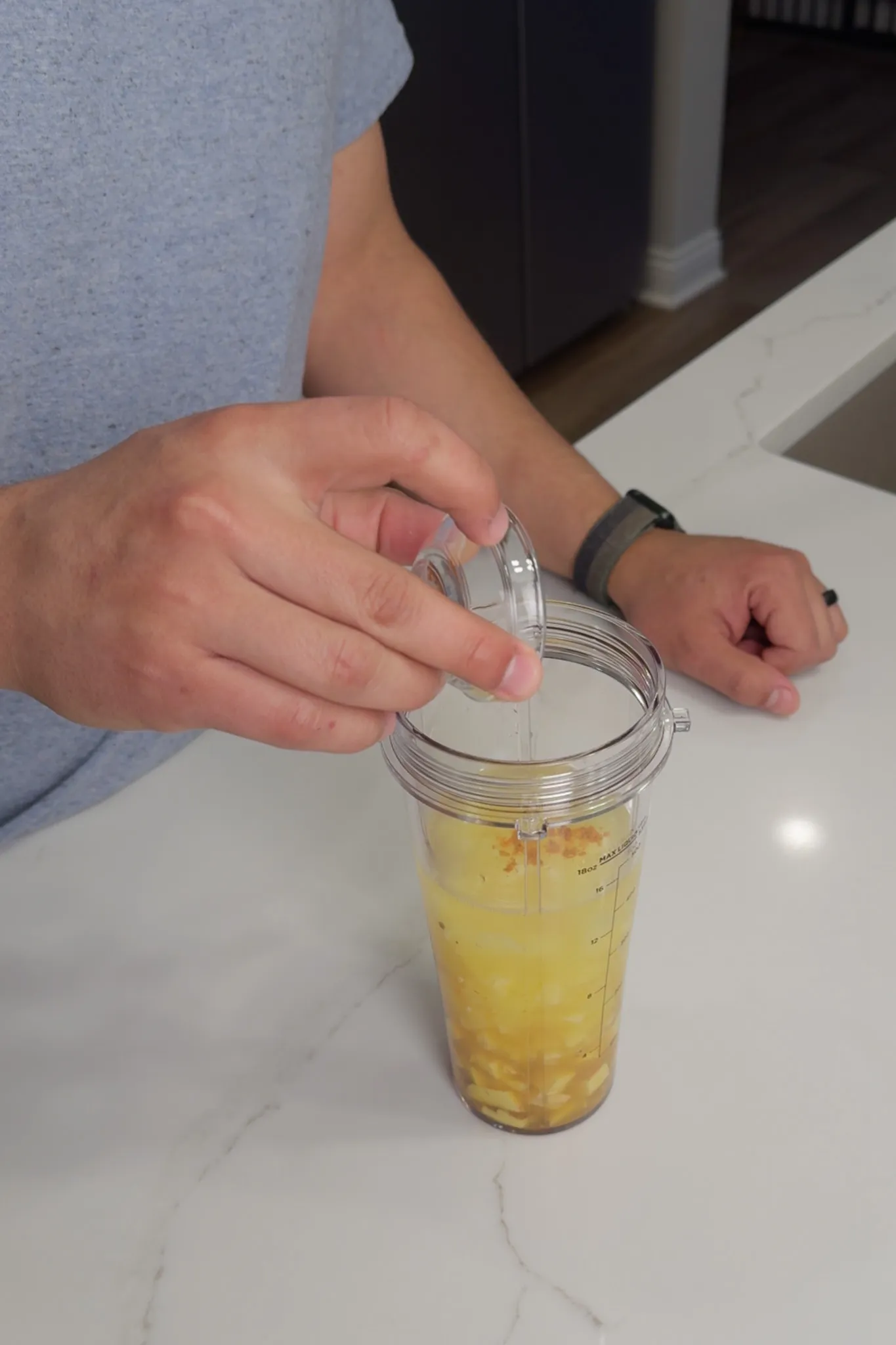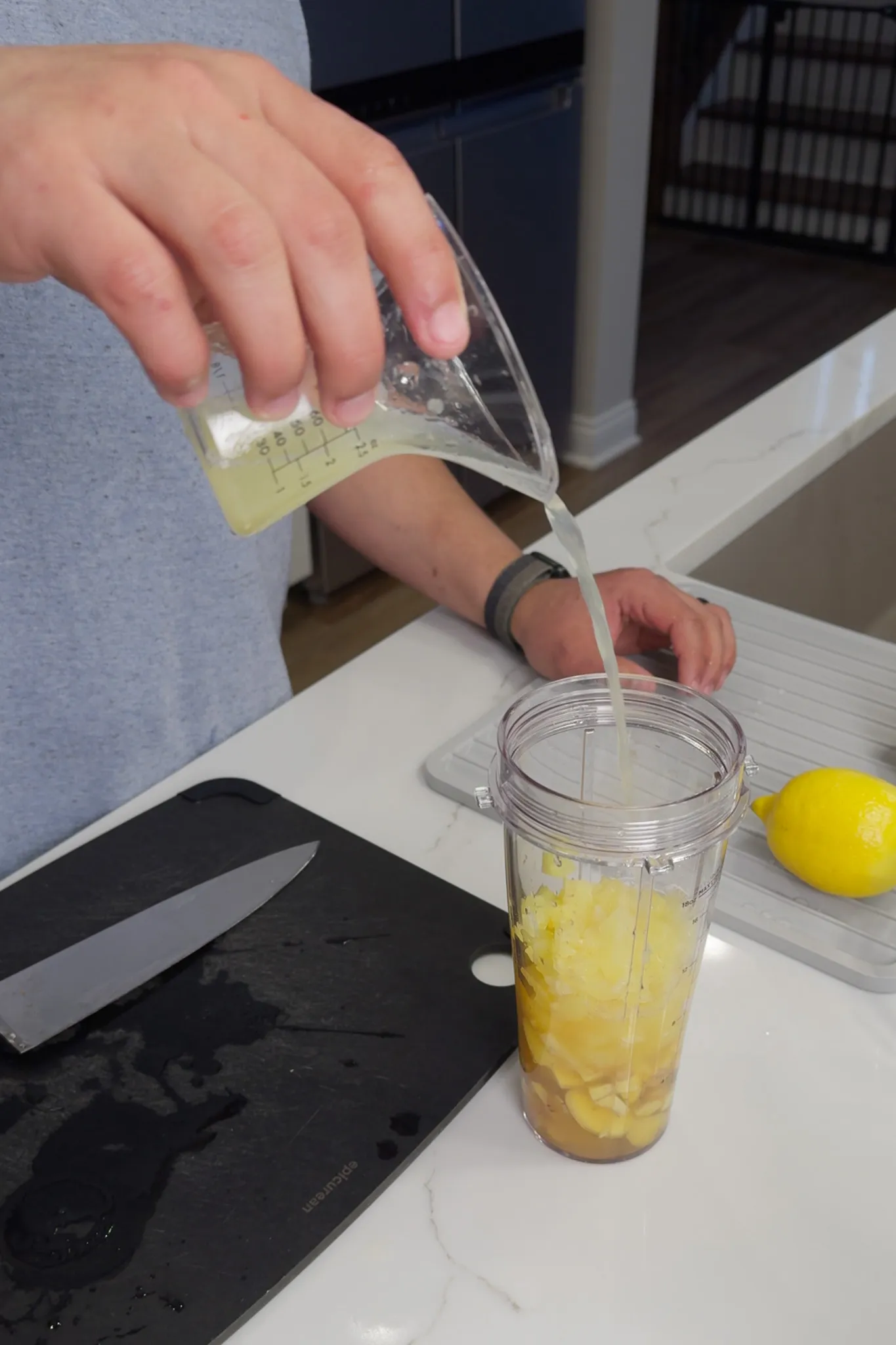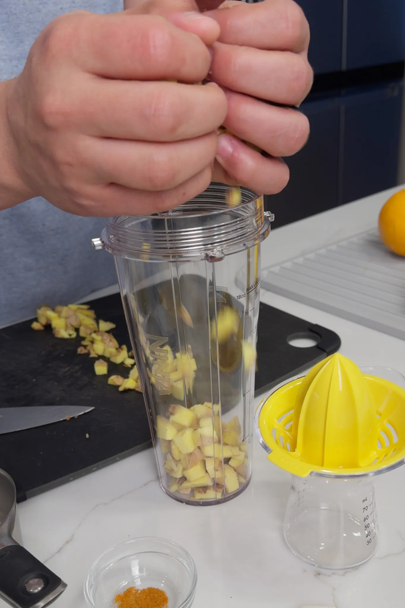 - Add ginger and all remaining ingredients to a blender. Using a personal-size blender, you must divide ingredients into two equal batches. Blend until smooth.