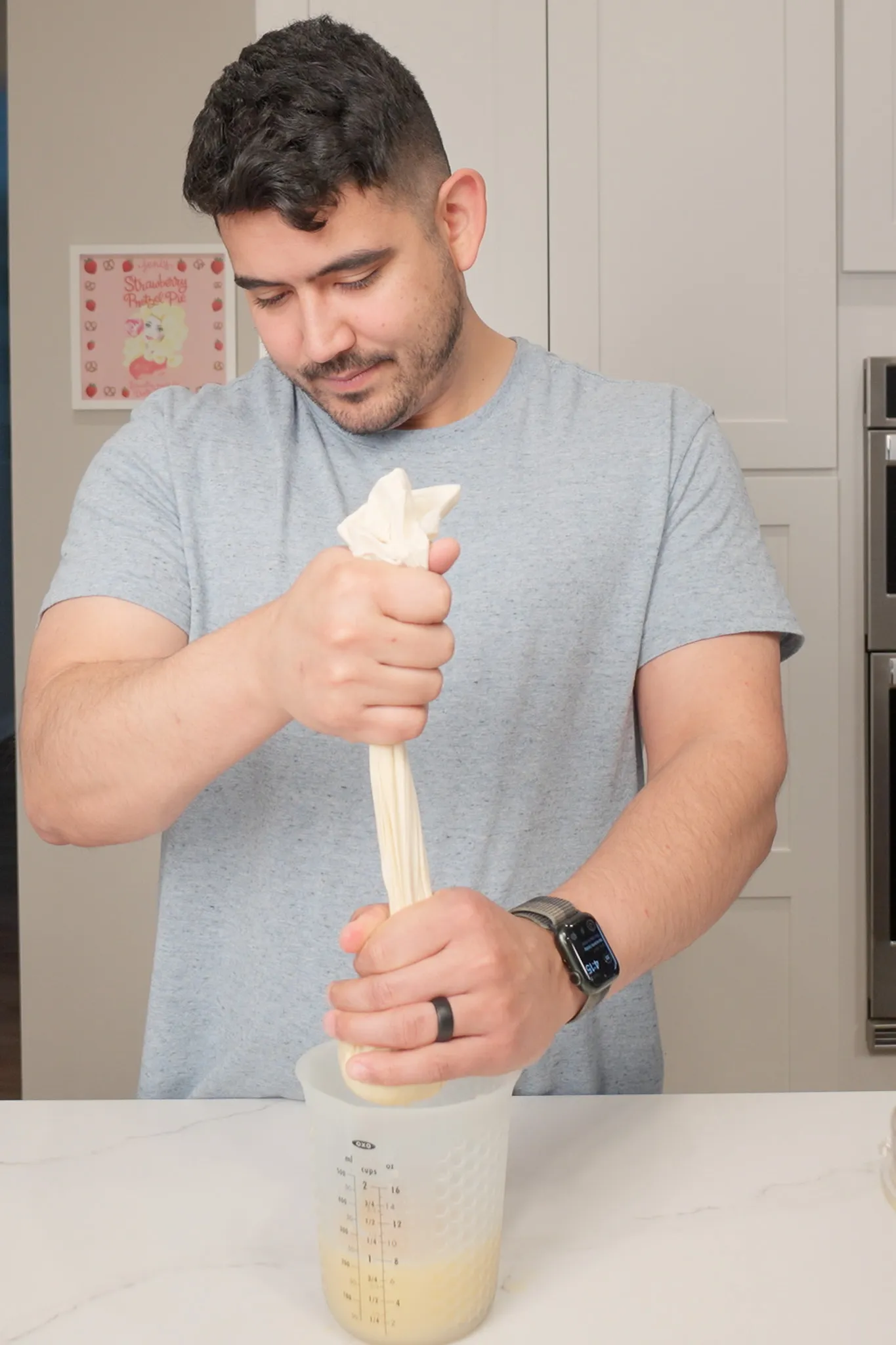 - Strain through a cheesecloth (or strainer) over a large measuring cup to capture skin and pulp. Discard solid pieces.