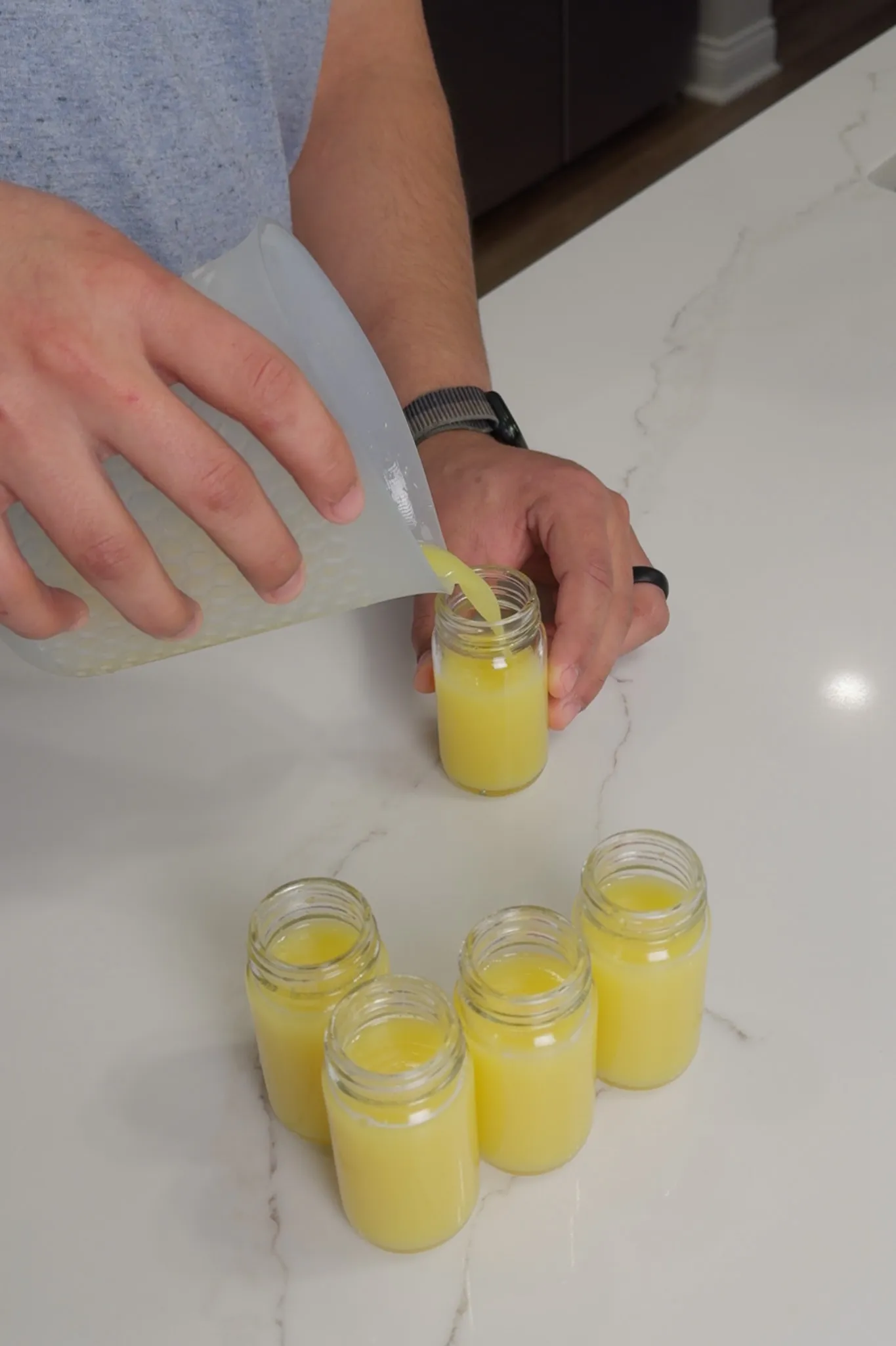 - Pour 2 ounces into each jar. Repeat until all jars have an equal amount of tonic in them.