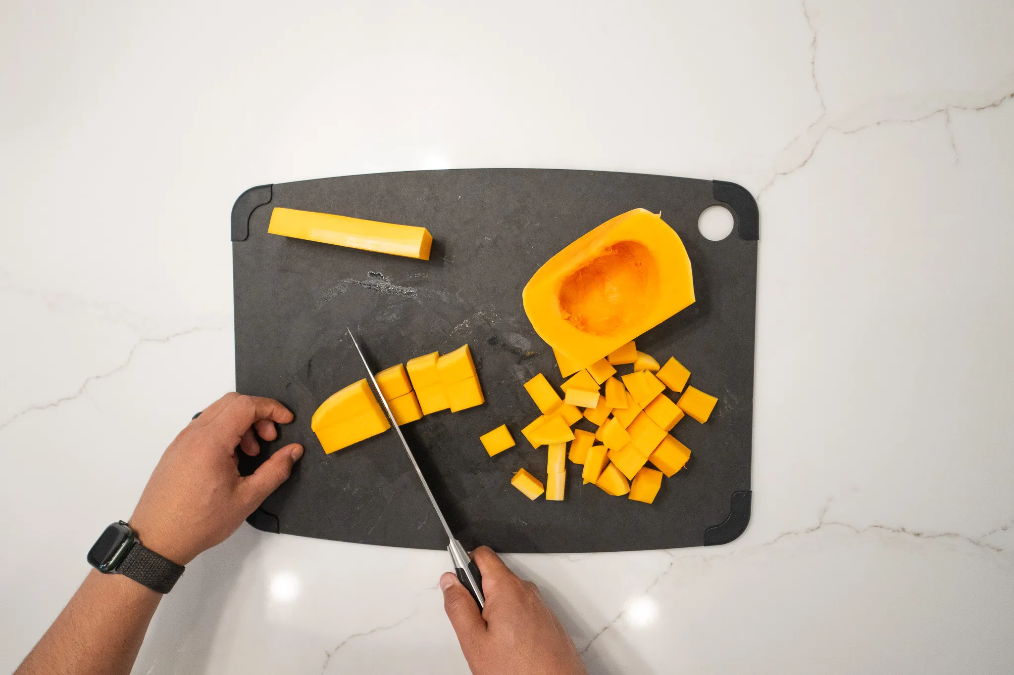- Cook butternut squash for 8-10 minutes. Add cinnamon and stir during the last 2 minutes. Remove from pan and cover with foil.