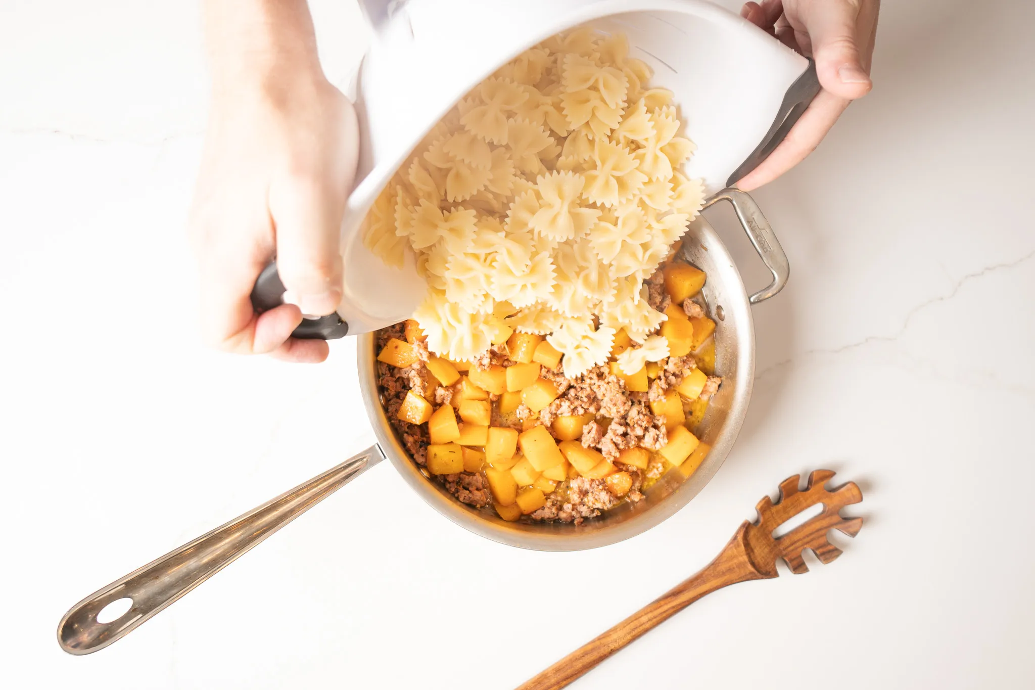 - Stir in reserved pasta, water, and cheese to sauté pan. Cook for 1-2 minutes and add the butternut squash. Remove from heat.