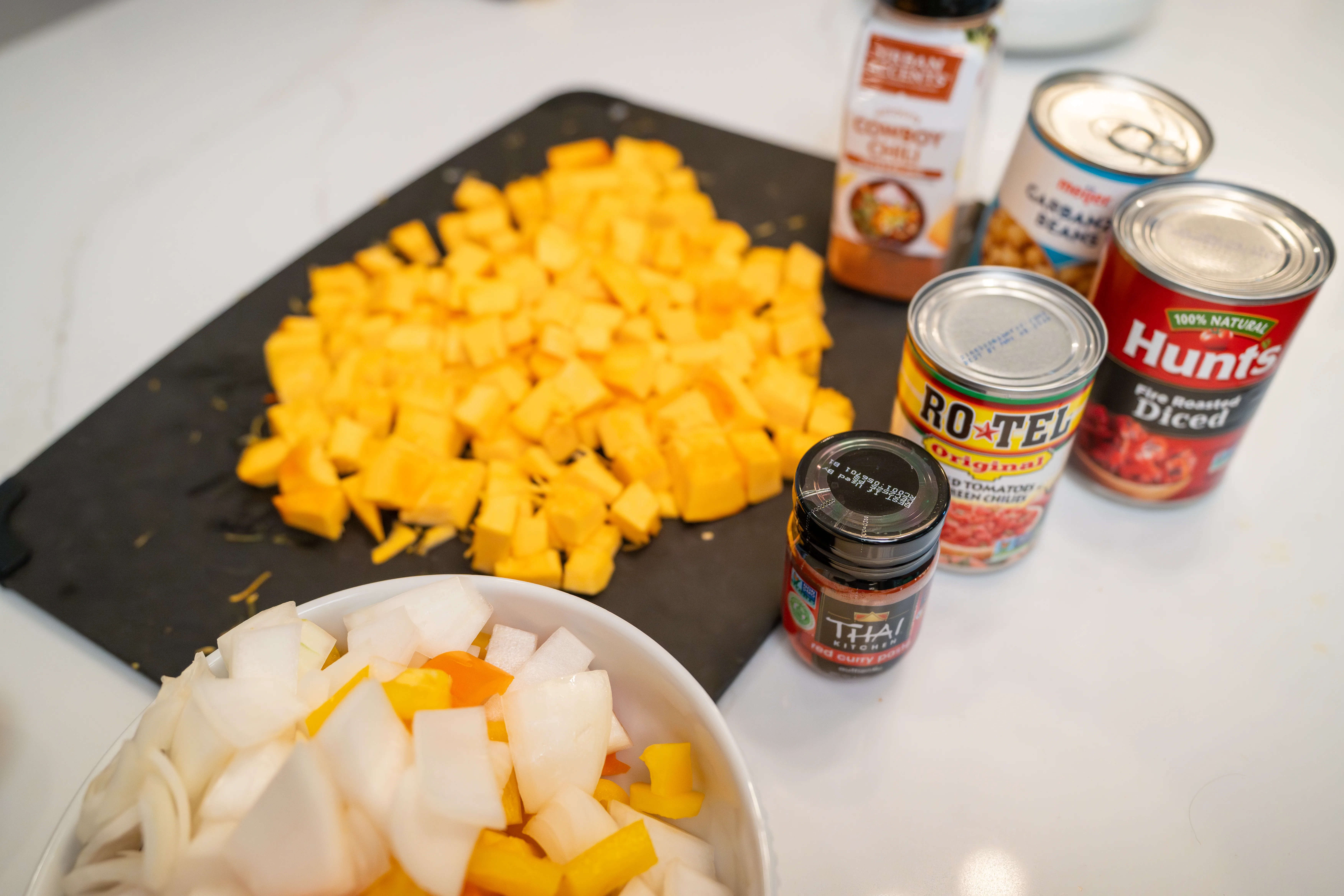 - Cook the preferred protein in a Dutch oven over medium heat. Reduce the heat to low and add onion, peppers, roasted pumpkin, curry paste, chili powder, canned tomatoes, and beans. Cover and cook for 45 minutes, stirring occasionally.