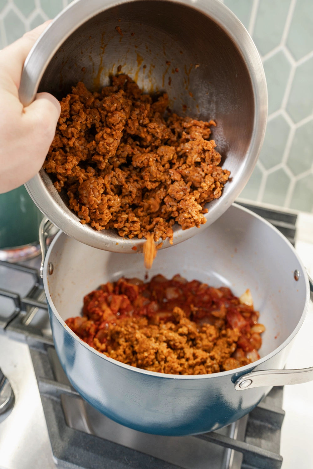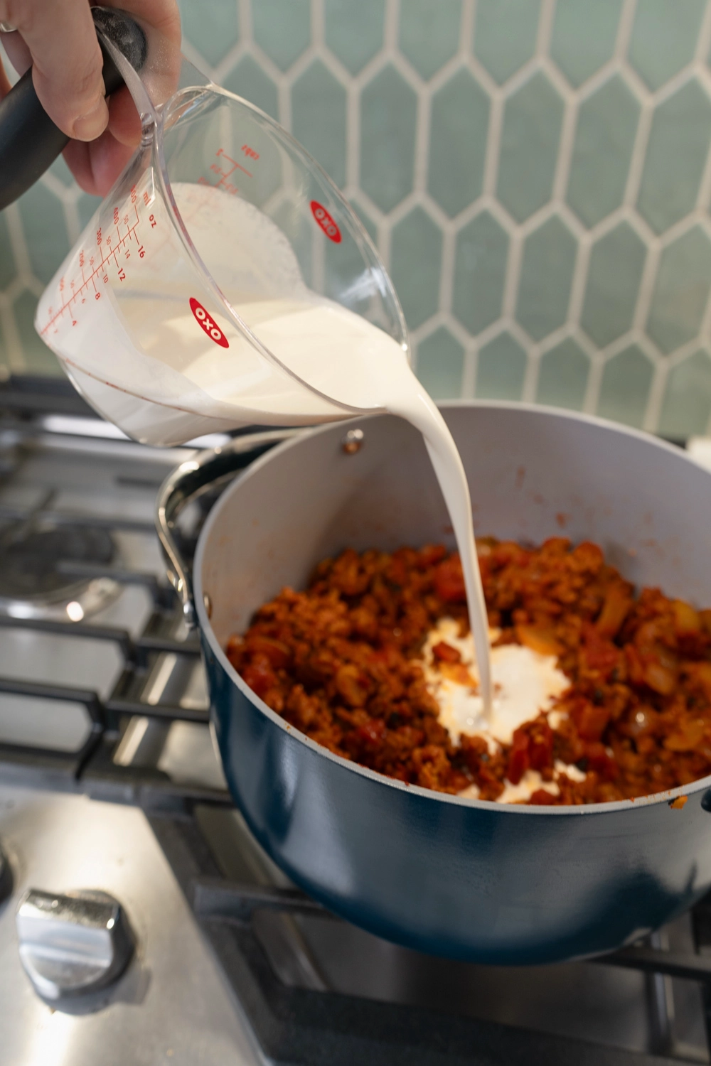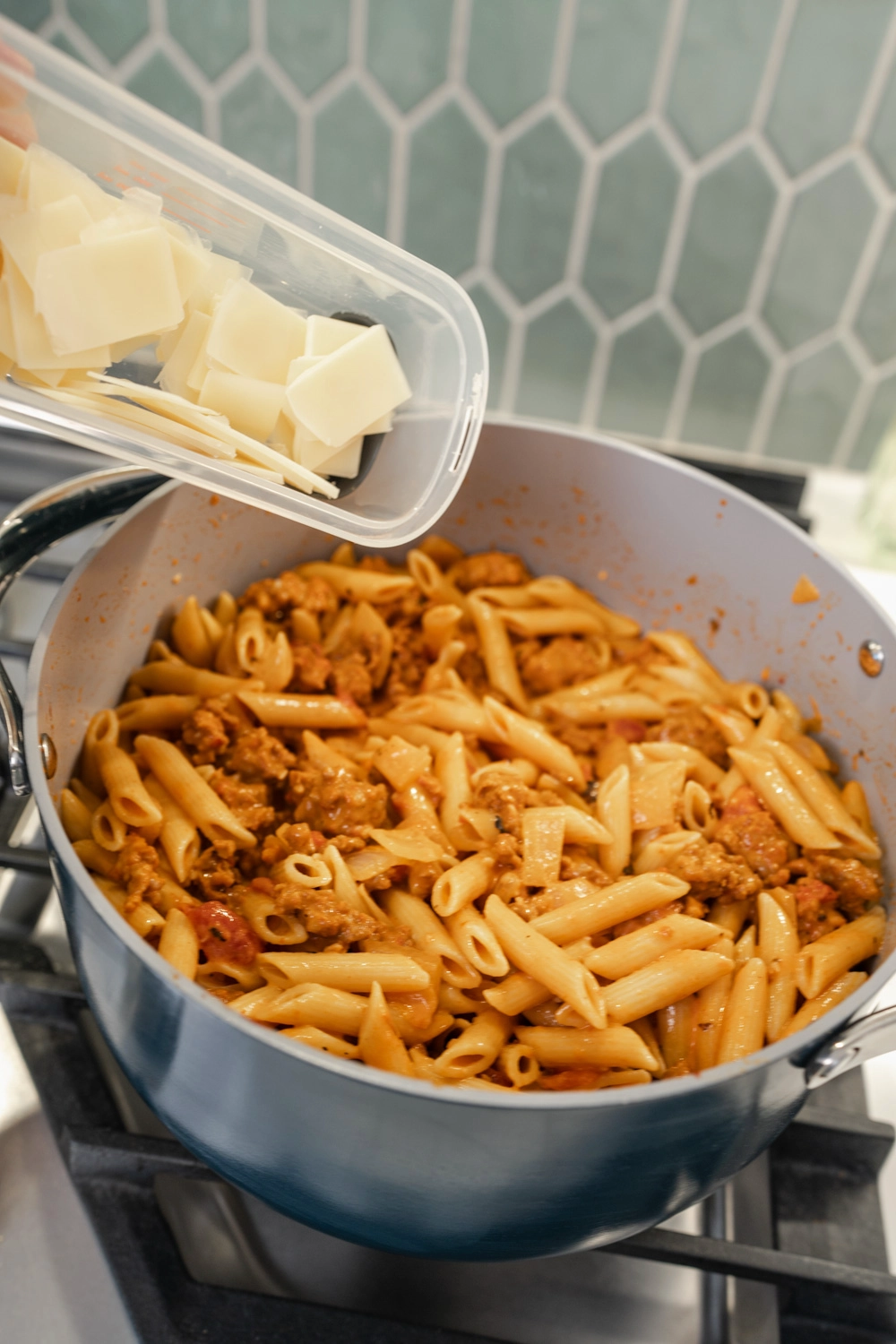 - Combine meat sauce, pasta, and then fold in the cheese.