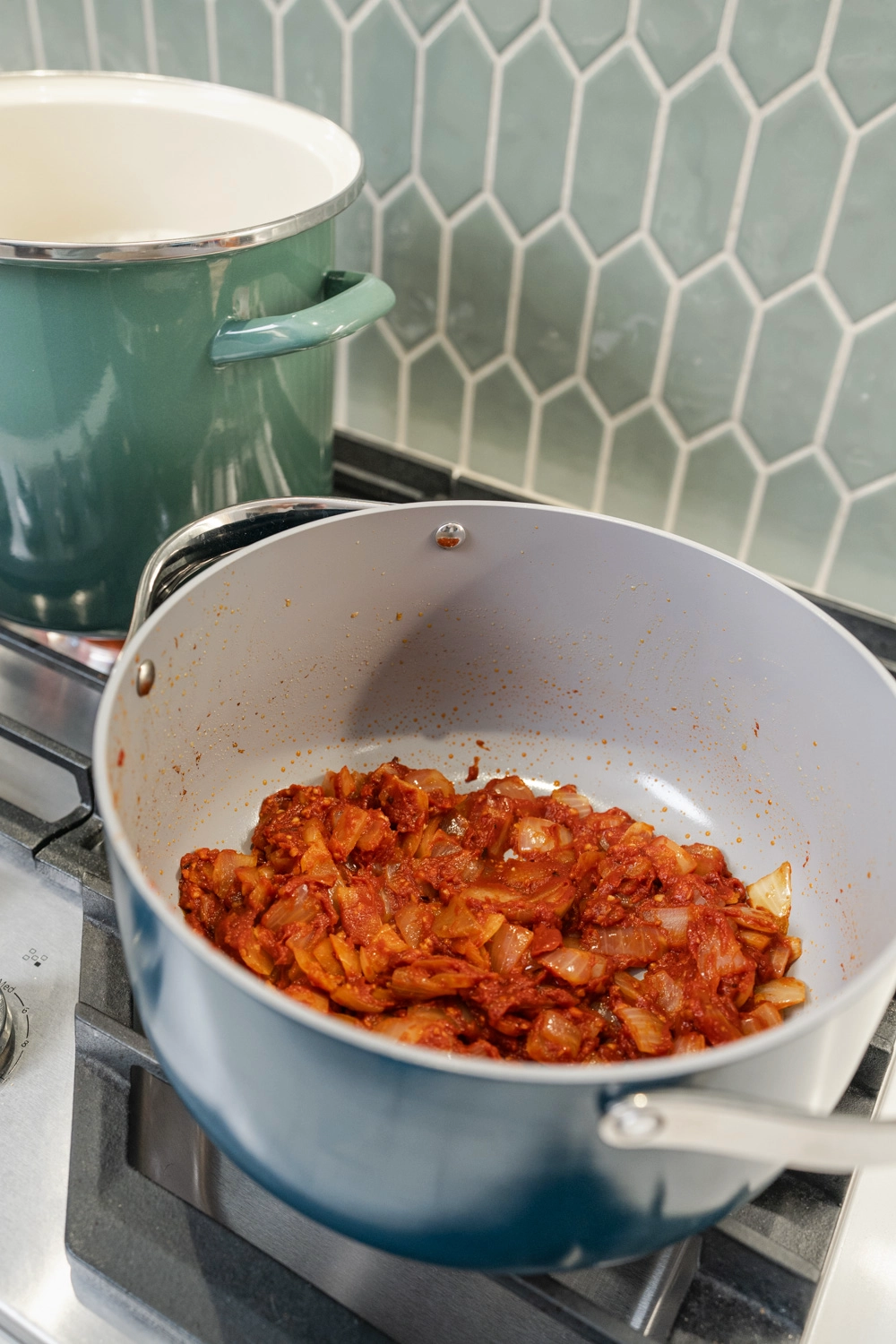 - Add butter to the dutch oven, and cook onions until tender. Add garlic and cook for one minute. Add tomato paste, stir and cook for another minute. Pour in tomatoes. Combine with cooked sausage.